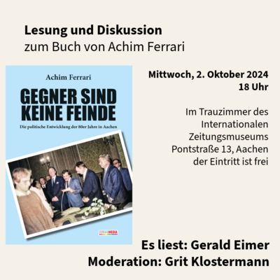 09/2024 | Die GRÜNE Fraktion in Aachen lädt herzlich ein zur Lesung und Diskussion am 2.10. um 18:00 Uhr im IZM