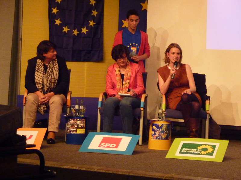 Die Aula des Einhard-Gymnasiums war mit etwa 600 Personen gut gefüllt, als die VertreterInnen der im EU Parlament vertretenen Parteien auf der Bühne Platz nahmen: Sabine Verheyen MdEP (CDU), Claudia Walther (SPD Aachen), Terry Reintke, (Bündnis 90/Die GRÜNEN, Listenplatz 9) Fotios Amanatides (Die Piraten, Listenplatz 2) und Christian Gengenbach (DIE LINKE Aachen).
