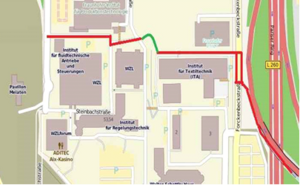 a) Zwischen ITA und Sommerfeldstraße (der Höhenunterschied muss überwunden werden / der Weg ist grün in der Zeichnung eingezeichnet).