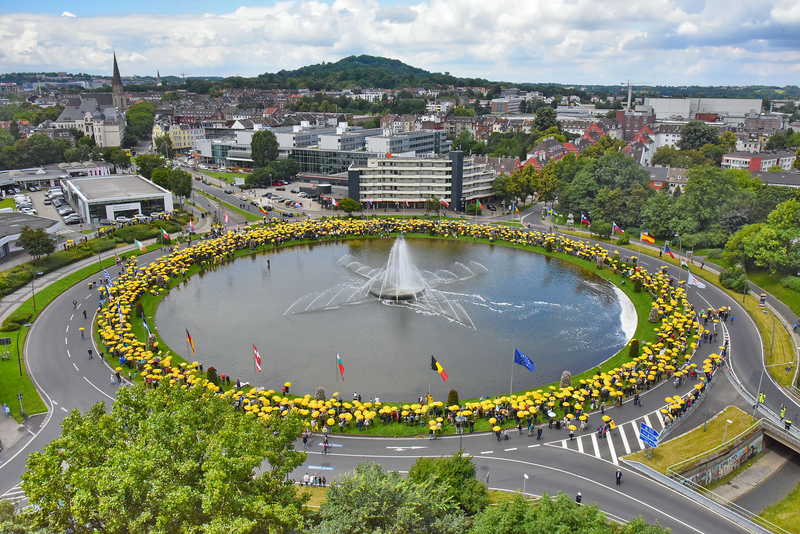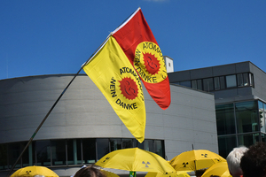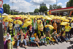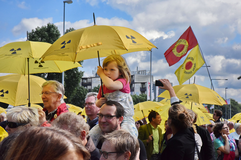Ein Meer aus fröhlich leuchtenden gelben Schirmen mit ernst gemeintem Aufdruck: Abschirmen unmöglich - da hilft nur Abschalten! Diese Botschaft gegen Atomenergie schickten etwa 4.000 Menschen am heutigen Sonntag, 26.6.16, vom Aachener Europaplatz aus über die Grenze des Dreiländerecks.