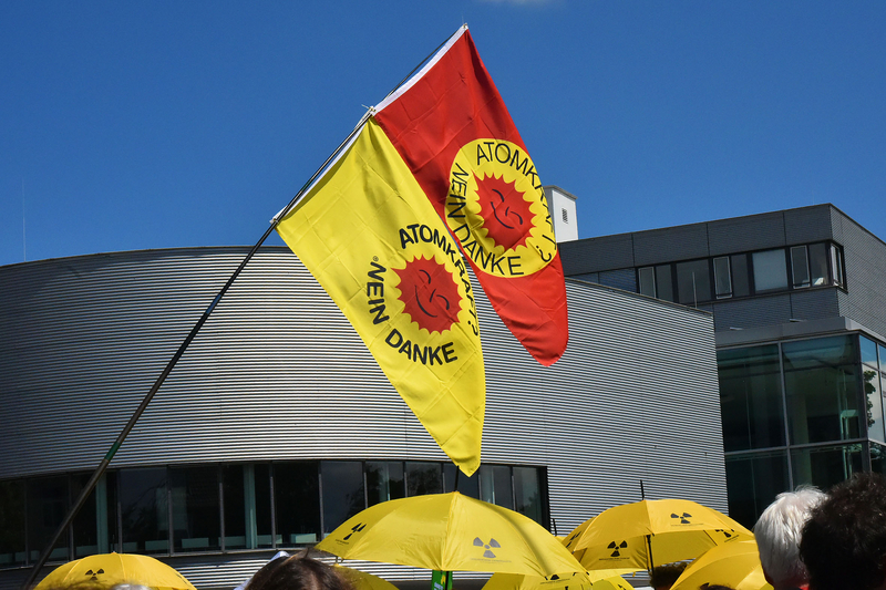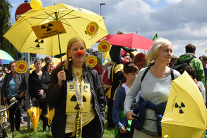 Die Schirme erfüllten übrigens gleich mehrere Zwecke: als Ausdruck des Protestes für den Ausstieg aus der Atomenergie, als Sonnenschirm während der Veranstaltung und – direkt nach Ende – endlich auch ihrer Bestimmung gemäß als Regenschirm. Ein über die Grenze angereister Wolkenbruch ging freundlicherweise erst nach Ende der Aktion nieder.