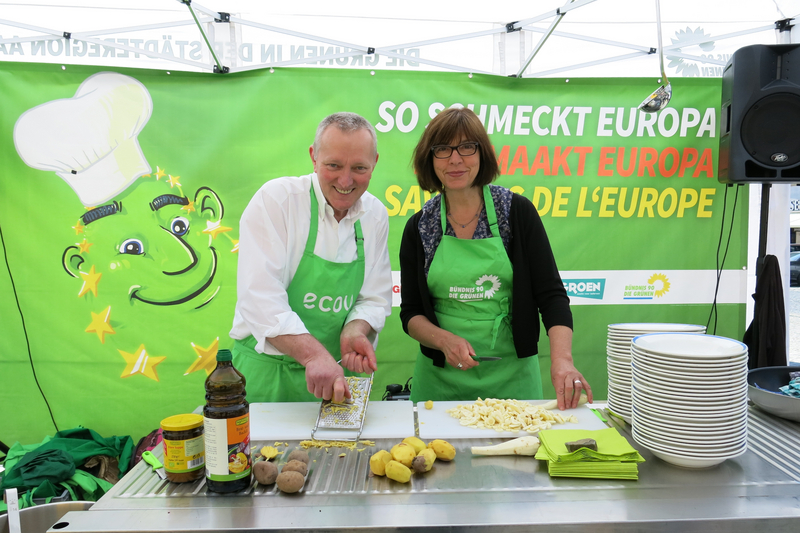 Mit dieser Aktion wollten die GRÜNEN auf Lebensmittelverschwendung aufmerksam machen. Mit Zutaten, die eigentlich für die Tonne bestimmt waren, zauberte Rebecca Harms, Spitzenkandidatin der Europa GRÜNEN, mit Hilfe eines belgischen Spitzenkochs ein köstliches Gericht. Nebenbei wurde natürlich über europäische Themen berichtet.