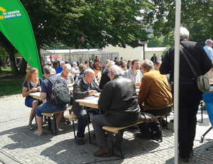 Gutes Leben hängt u.a. von gutem Essen ab. Bei Sonnenschein und Gemüsesuppe zeigte der Grüne Kreisverband am Samstag 17. Mai 2014 auf dem Aachener Markt, wie gutes Essen günstig zubereitet werden kann.