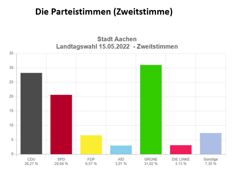 Astrid Vogelheim ist mit 37,19% der Stimmen als Direktkandidatin in den Landtag eingezogen. Henning Nießen lag mit knapp 30% Stimmanteil hauchdünn hinter seiner Gegenkandidatin von der CDU. Der Zweitstimmenanteil lag für die Gesamtstadt Aachen bei sagenhaften 31,02%!