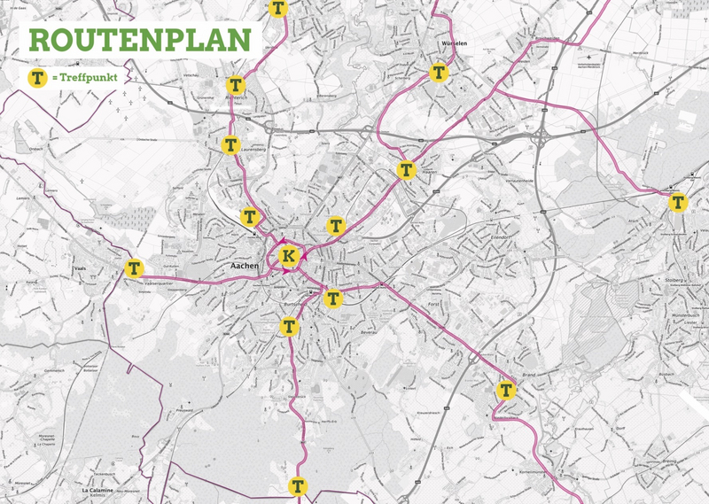 Unsere Fahrrad-Sternfahrt führt wieder von verschiedenen Punkten rund um Aachen in Richtung Innenstadt.