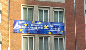 Heute haben die Bundeskanzlerin Angela Merkel und Frankreichs Staatschef Emmanuel Macron einen neuen Freundschaftspakt in Aachen besiegelt. Aus diesem Grund haben wir ein Banner mit der Aufschrift „Europe unie & forte - sozialer, gerechter und ökologischer“ vor dem Aachener Rathaus aufgehängt.
