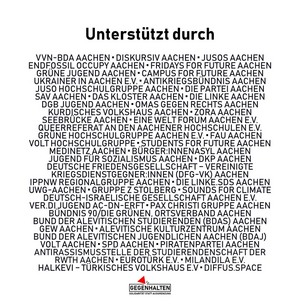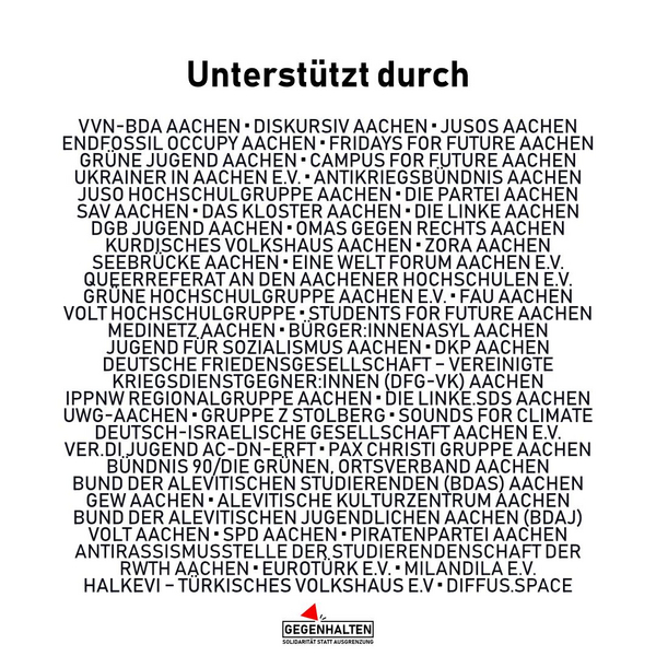 VVN-BDA AACHEN || DISKURSIV AACHEN || ENDFOSSIL OCCUPY AACHEN || FRIDAYS FOR FUTURE AACHEN || LINKE.SDS AACHEN || GRÜNE JUGEND AACHEN || JUSOS AACHEN || UKRAINER IN AACHEN E.V. || ANTIKRIEGSBÜNDNIS AACHEN || JUSO HOCHSCHULGRUPPE AACHEN || DIE PARTEI AACHEN || SAV AACHEN || DAS KLOSTER AACHEN || FAU AACHEN || OMAS GEGEN RECHTS AACHEN || KURDISCHES VOLKSHAUS AACHEN || ZORA AACHEN || VER.DI JUGEND AC-DN-ERFT || DIE LINKE AACHEN || QUEERREFERAT AN DEN AACHENER HOCHSCHULEN E.V. || GRÜNE HOCHSCHULGRUPPE AACHEN E.V. || DGB JUGEND AACHEN || EINE WELT FORUM AACHEN E.V. || GEW AACHEN || STUDENTS FOR FUTURE AACHEN || MEDINETZ AACHEN || BÜRGER:INNENASYL AACHEN || JUGEND FÜR SOZIALISMUS AACHEN || DEUTSCHE FRIEDENSGESELLSCHAFT – VEREINIGTE KRIEGSDIENSTGEGNER:INNEN (DFG-VK) AACHEN || SEEBRÜCKE AACHEN || IPPNW REGIONALGRUPPE AACHEN || UWG-AACHEN || DEUTSCH-ISRAELISCHE GESELLSCHAFT AACHEN E.V. || PAX CHRISTI GRUPPE AACHEN | BÜNDNIS 90/DIE GRÜNEN, ORTSVERBAND AACHEN || BUND DER ALEVITISCHEN STUDIERENDEN (BDAS) AACHEN || ALEVITISCHE KULTURZENTRUM AACHEN || BUND DER ALEVITISCHEN JUGENDLICHEN AACHEN (BDAJ) || VOLT HOCHSCHULGRUPPE || VOLT AACHEN || PIRATENPARTEI AACHEN || CAMPUS FOR FUTURE AACHEN || DKP AACHEN || GRUPPE Z STOLBERG || ANTIRASSISMUSSTELLE DER STUDIERENDENSCHAFT DER RWTH AACHEN || MILANDILA E.V. || SPD AACHEN || SOUNDS FOR CLIMATE || EUROTÜRK E.V. || HALKEVI – TÜRKISCHES VOLKSHAUS E.V. || DIFFUS.SPACE || ONE VOICE FOR WOMEN LIFE FREEDOM WOMEN || DGB REGION NRW SÜD-WEST || VEREIN ZUR FÖRDERUNG DES MULTIKULTIFESTES E.V. || WELTHAUS AACHEN E.V. || RAINBOW AACHEN E.V. || AACHENER FRIEDENSPREIS E.V. || NELL-BREUNING-HAUS HERZOGENRATH || BDKJ AACHEN || REFUGIO E.V. || CAFÉ ZUFLUCHT AACHEN || BI BÜRGERRAT FÜR AACHEN || HEALTH FOR FUTURE