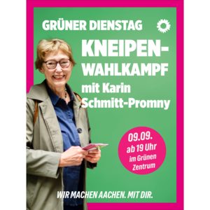 Am Dienstag, 9. September, gehen wir wieder in die Aachener Kneipen – diese Woche gemeinsam mit Karin Schmitt-Promny, unserer Kandidatin für das Amt der Städteregionsrätin. Wir sind unter den Menschen, hören zu, und kommen ins Gespräch – ehrlich, direkt und mit guter Laune.
