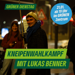 Diesen Dienstag geht’s ab 19 Uhr los! Gemeinsam mit unserem Bundestagskandidaten Lukas Benner starten wir mit einem offenen Austausch: Stelle Lukas all deine Fragen – sei es zum Wahlkampf, den GRÜNEN oder was dich sonst interessiert. Danach ziehen wir in die Kneipen, um ins Gespräch zu kommen und unser GRÜNES Programm direkt zu den Leuten zu bringen!