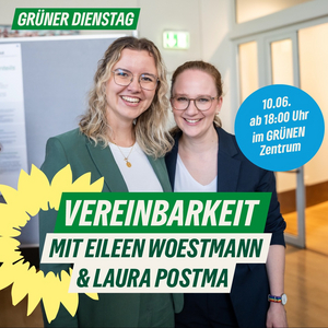 Am Dienstag, 10. Juni, sprechen wir mit Eileen Woestmann, Sprecherin für Kinder und Familie der GRÜNEN Landtagsfraktion NRW, und Laura Postma, ebenfalls GRÜNE Landtagsabgeordnete, über politische Ansätze, persönliche Erfahrungen und strukturelle Herausforderungen rund um das Thema Vereinbarkeit.