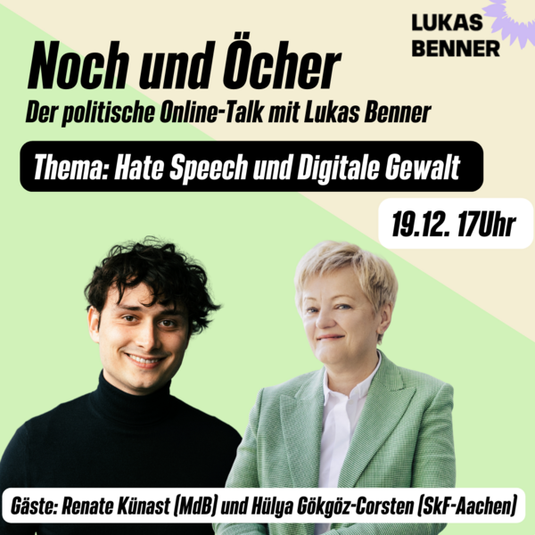 Bei seinem wiederkehrenden Online Format möchte Lukas Benner mit seinen Gästen Renate Künast und Hülya Gökgöz-Corsten wichtige Fragen zum Thema Hate Speech und digitale Gewalt gegen Frauen besprechen. Was erleben Frauen im Internet? Hat sich das in den letzten Jahren verändert? Wie kann man Täter*innen sanktionieren? Wie Betroffene besser schützen? Welche rechtlichen Grundlagen sind für eine effektive Bekämpfung von Hass im Netz erforderlich?